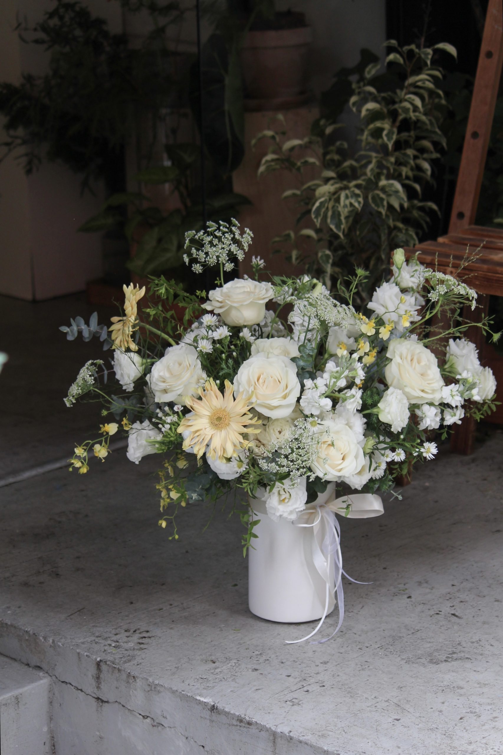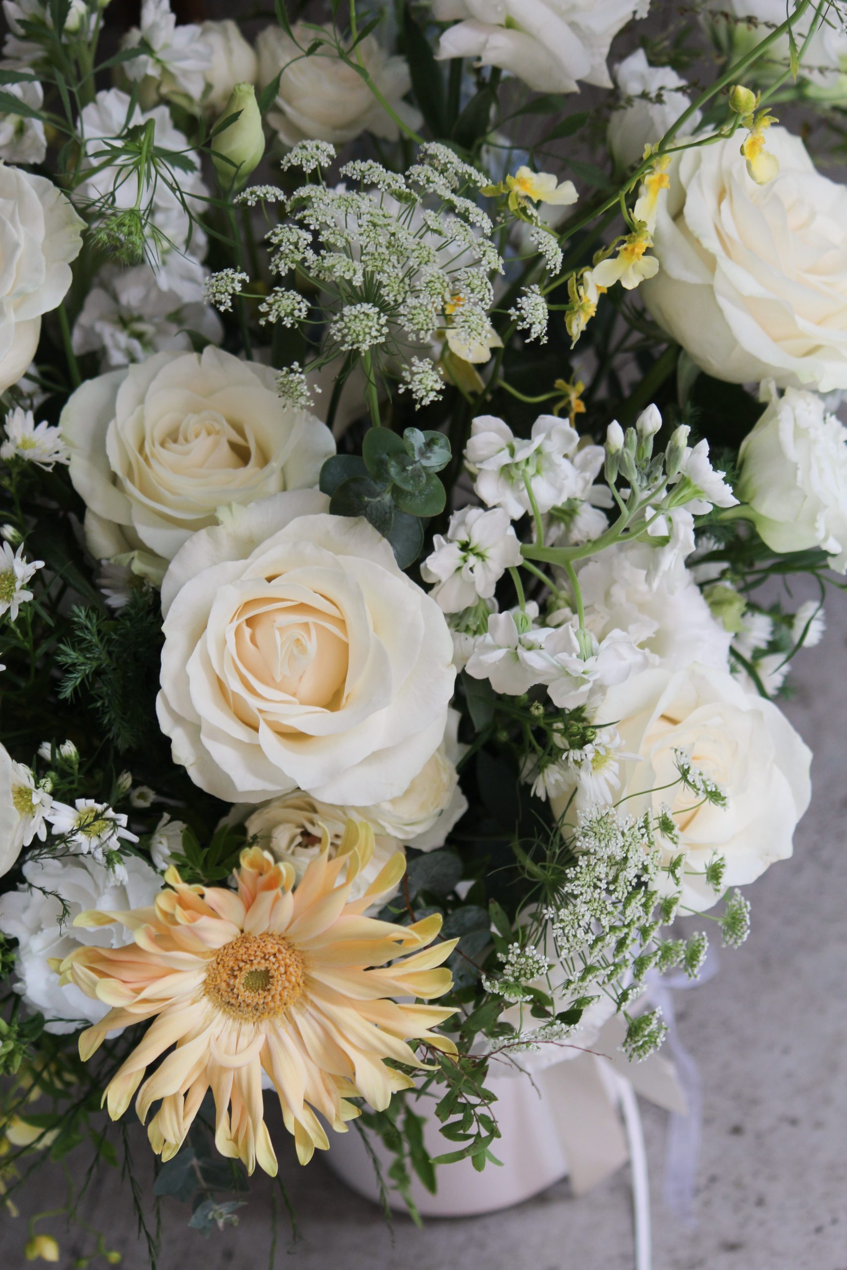 純潔的玫瑰和清新的桔梗,散發著恬靜的美感;奶油鵝黃色的花材,如非洲菊和文心蘭,則增添了柔和的光澤與暖意。