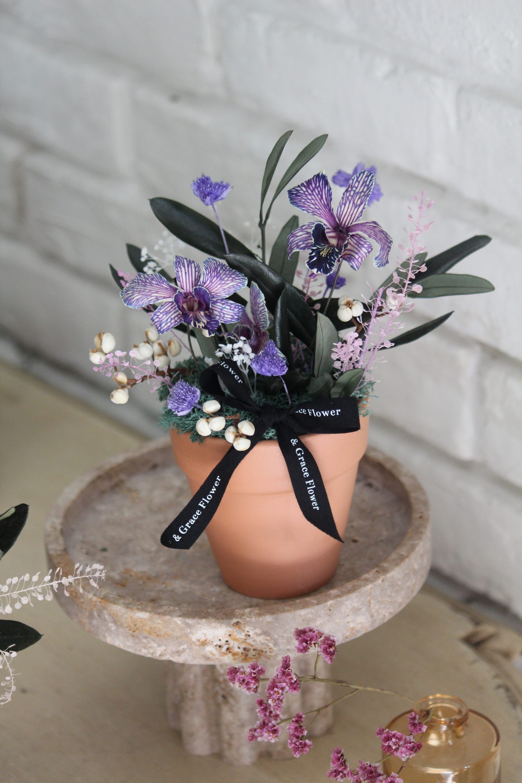 蘭花的纖細優美與紫色的永生花相得益彰,增添了一份大自然的靜謐與高貴氣息。