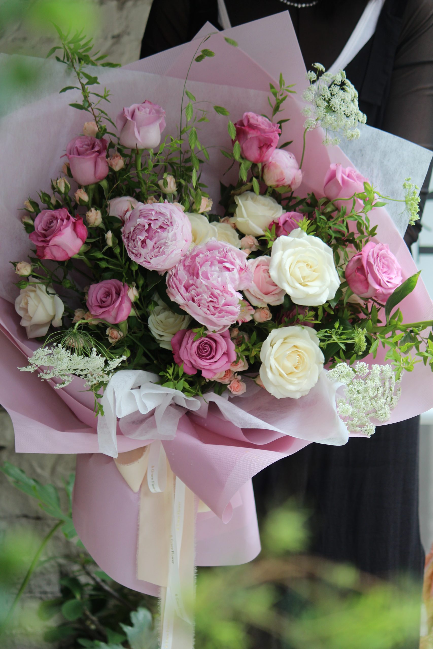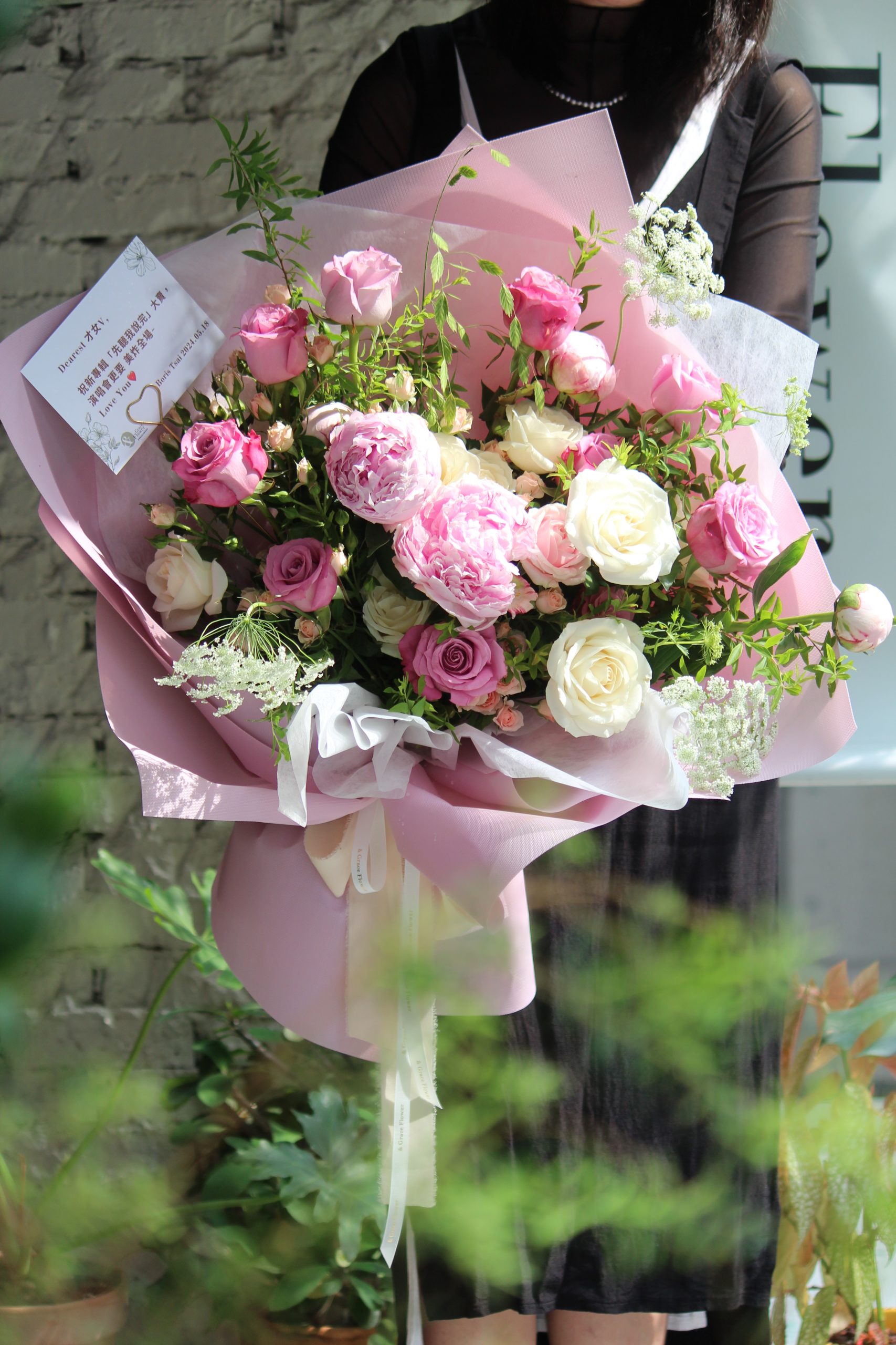 白色玫瑰代表純潔和愛的承諾,與粉色芍藥形成柔和的色彩對比,增添了花束的優雅氣息。